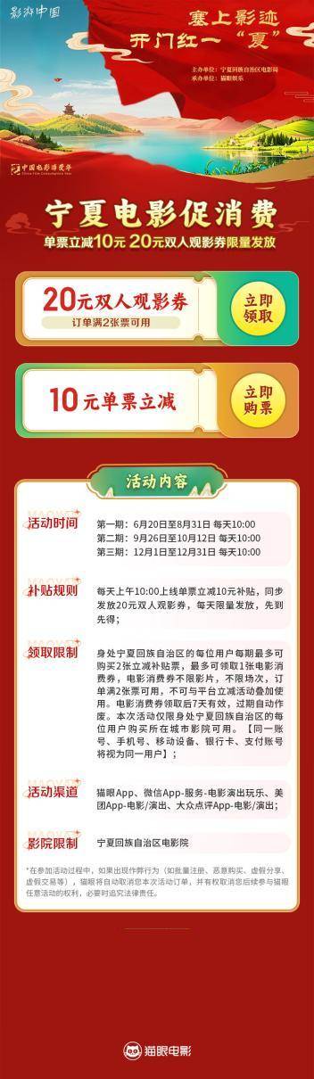 为激活电影市场消费活力,推动文化消费升级,由中共宁夏回族自治区委员会宣传部(自治区电影局)主办、猫眼娱乐承办的“塞上影迹·开门红一夏”电影促消费活动于2025年6月20日正式启幕。此次电影惠民活动一直持续至2025年12月31日,横跨8个月,分别覆盖暑期、国庆黄金周两大黄金档期,以真金白银的观影补贴为宁夏观众打造惠民文化盛宴。